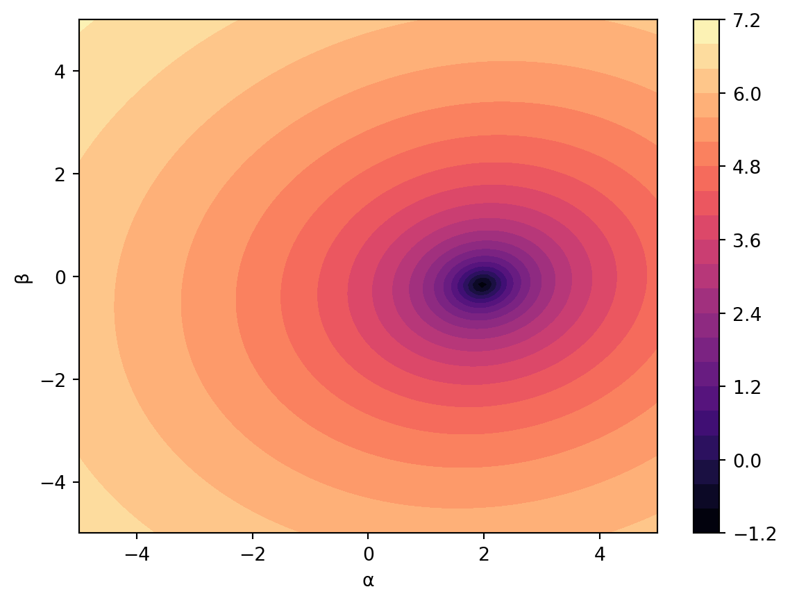 In this example, because there are two parameters, we want to find the value of \(\alpha\) and \(\beta\) that simultaneously minimizes the sum of squared errors. The figure below shows the SSE surface. Looking at the figure suggests that an \(\alpha\) close to 2 and \(\beta\) close slightly less than 0 is the minimum.
