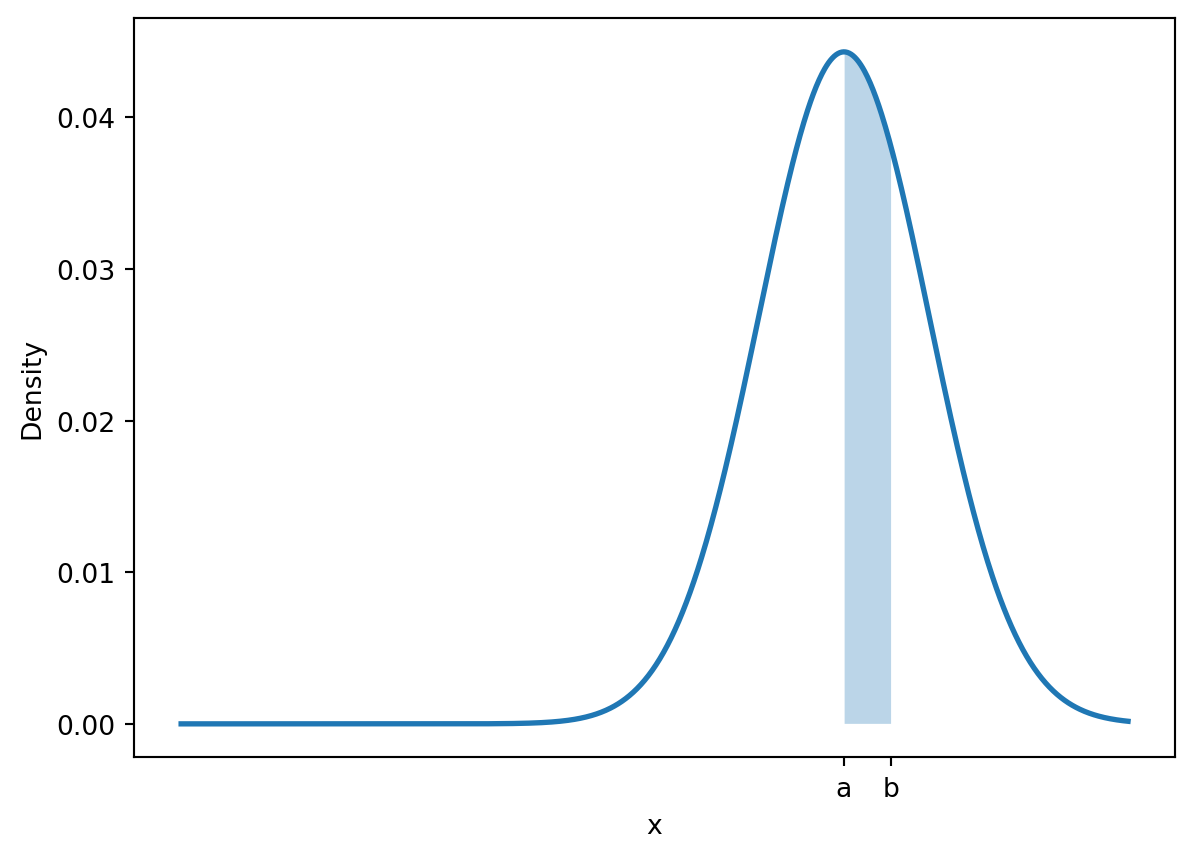 \[ P(a \leq X \leq b) = \text{area under $f$ between $a$ and $b$} \]