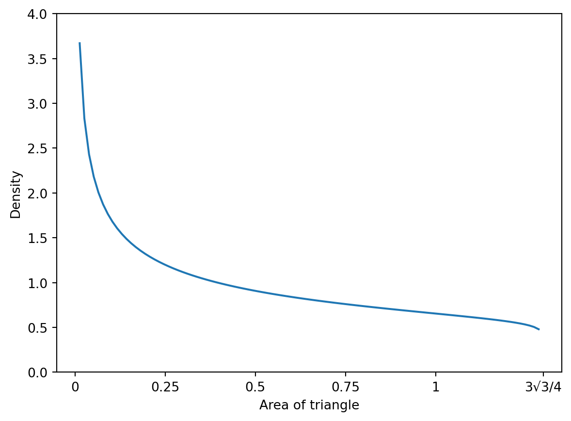 The density function of the area of such triangles is an interesting shape. In the figure below, we approximated the density with a scaled beta distribution.