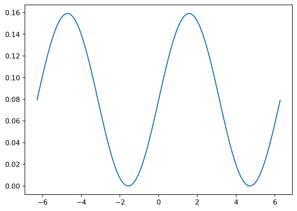 \[ f(x) = \frac{1}{4\pi}(\sin(x) + 1) \qquad -2\pi \leq x \leq 2\pi \]