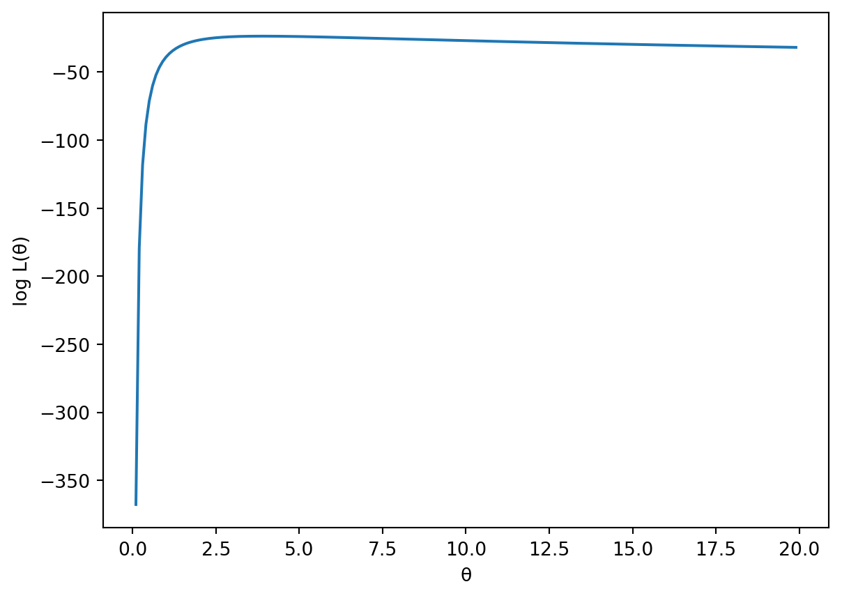 If \(\theta\) is unknown, one way to estimate it from the observed data \(x\) using maximum likelihood. More details are provided in the estimation section, but the basic idea is to find the value of \(\theta\) that maximizes the log likelihood function, which is
