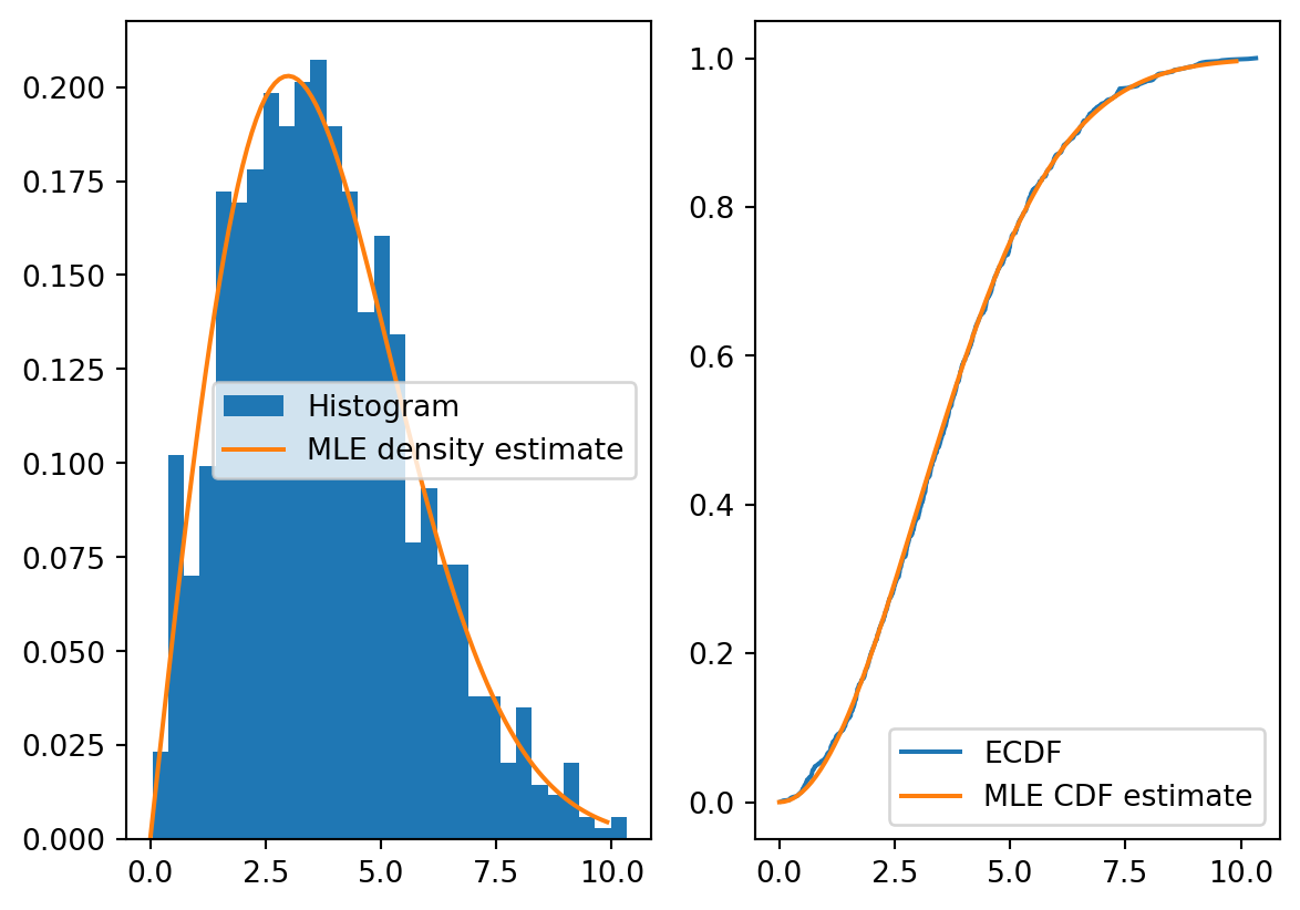Let’s generate a few more observations so that we can visualize the distribution and compare it to the MLE estiamte. With 1000 draws, the histogram matches up nicely with the MLE density estimate. Likewise for the emperical CDF and the MLE CDF estimate.
