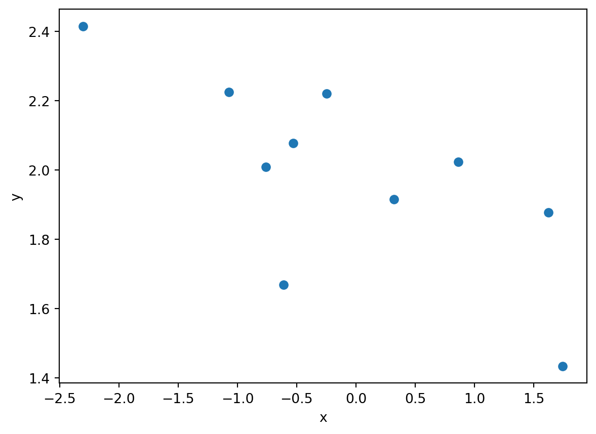 y = 2 - 0.3*x + np.random.normal(scale = 0.25, size = 10)