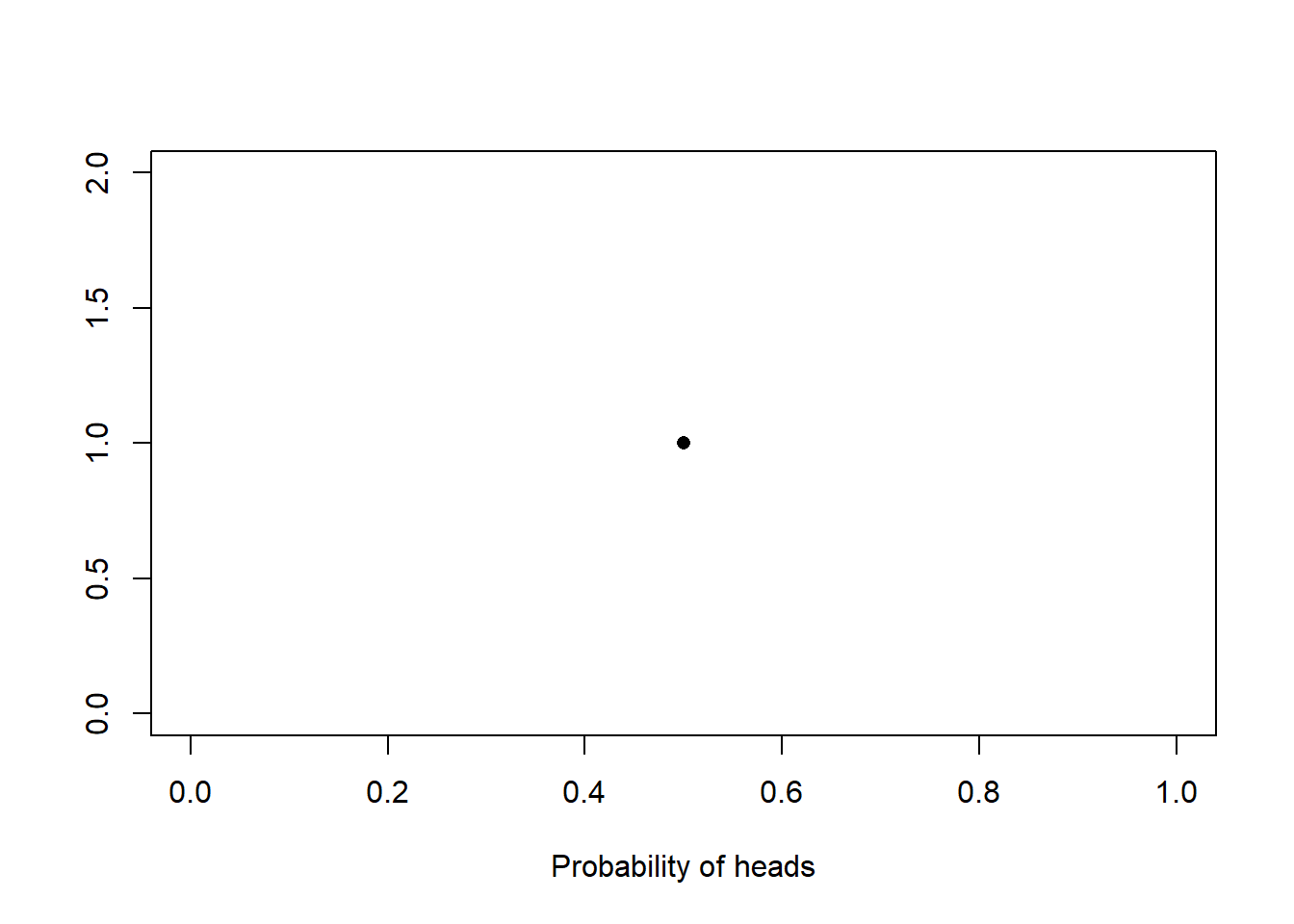 - Start with 0.9. Which is more likely: that the true probability of a heads is 0.5 or 0.9? How much more/less likely is 0.9 to be the true probability relative to 0.5? If it is equally likely, mark a point at (0.9, 1). If 0.9 is twice as likely to be the true probability of heads (compared to 0.5), then mark a point at (0.9, 2). If 0.9 is half as likely to be the true probability, mark a point at (0.9, 0.5). If you think 0.9 is X times more/less likely to be the true probability of heads, mark a point at (0.9, X).