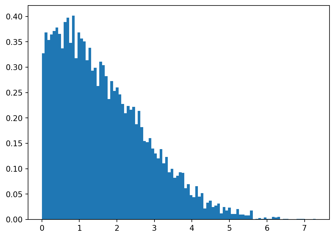 R =10000AF = st.expon.rvs(size=R,scale=3)BF = st.weibull_min.rvs(size=R, c =2, scale =3)SF = np.minimum(AF, BF)plt.close()plt.hist(SF, density =True,bins=100)Summary = {"Mean":f"{SF.mean().item():.2f} (years)" , "Median":f"{np.median(SF).item():.2f} (years)" , "SD":f"{np.std(SF).item():.2f} (years)" , "Var":f"{np.var(SF).item():.2f} (years^2)"}import pandas as pdsum1 = pd.DataFrame.from_dict(Summary, orient ="index", columns= ["Initial"])sum1