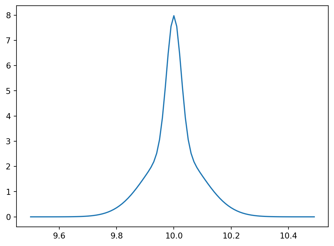 xx = np.arange(9.5,10.5,0.01)ay = st.norm.pdf(xx, loc =10, scale =0.1)by = st.norm.pdf(xx, loc =10, scale =0.025)yy =2/3*ay +1/3*byplt.close()plt.plot(xx,yy)