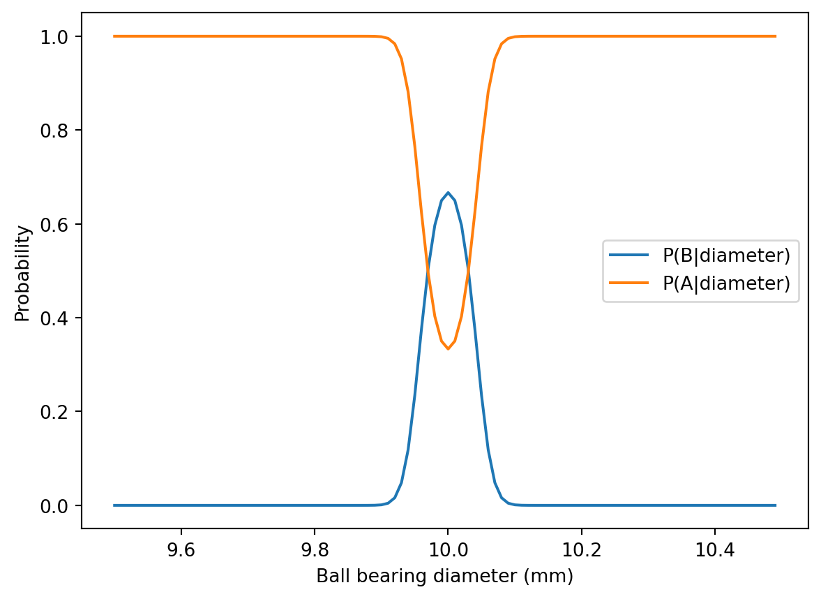 (B) Calculate the probability that a randomly selected ball bearing came from machine B given that its diameter is 9.9.