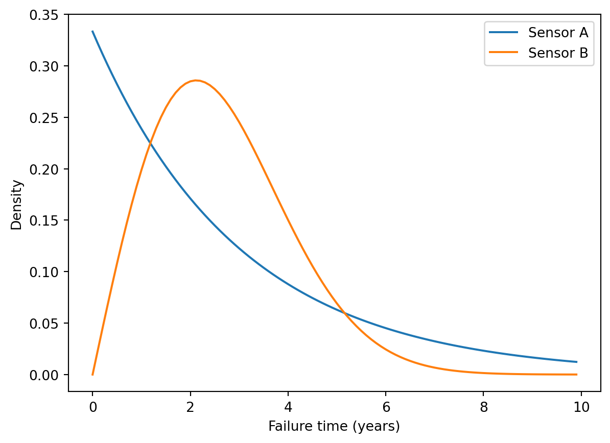 The system fails when either A or B fails. The failure time for sensor A follows an exponetial distribution with mean failure time of 3 years. The failure time for sensor B follows a Weibull distrubtion with scale = 3 and shape = 2.