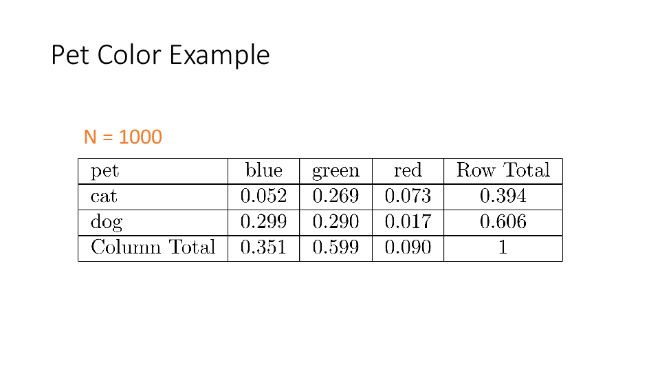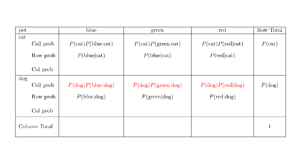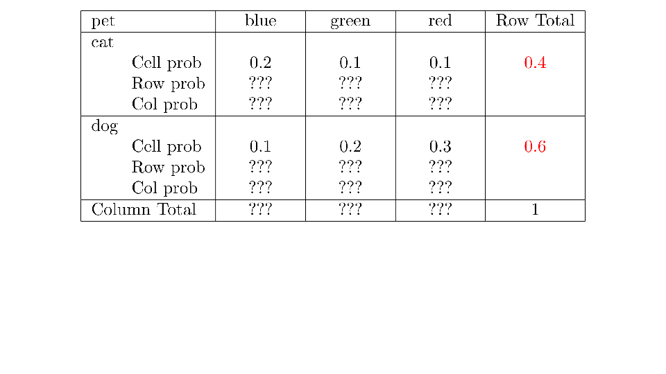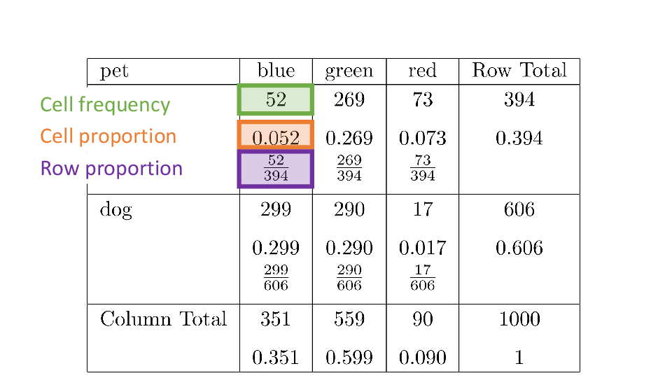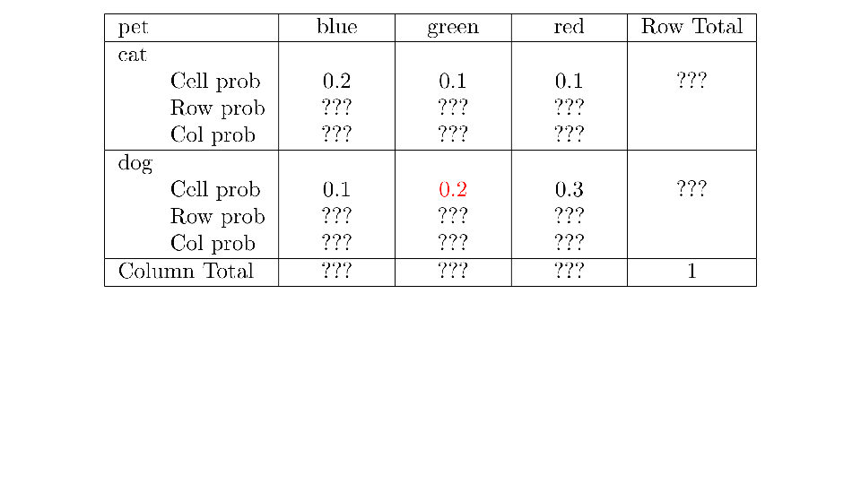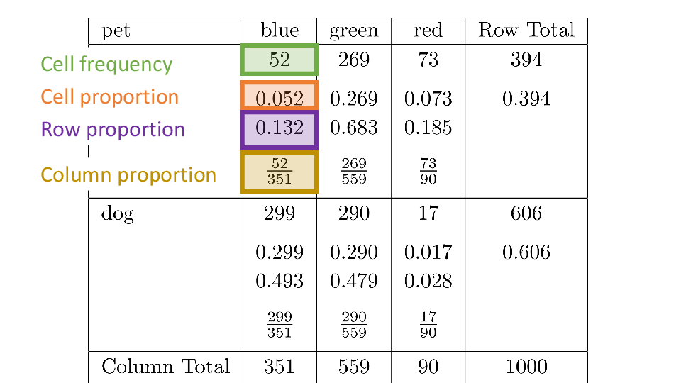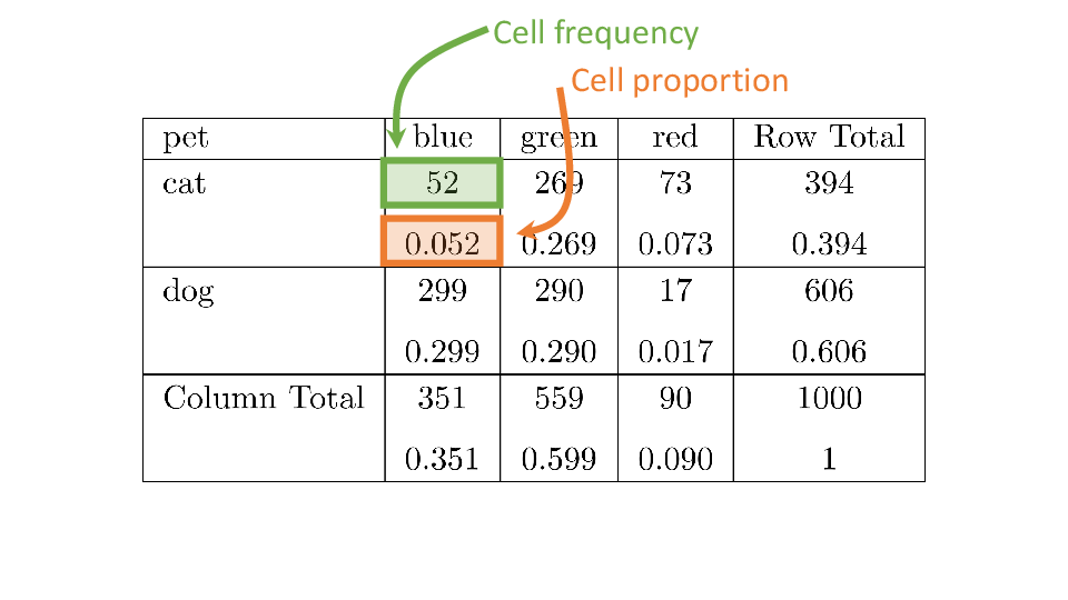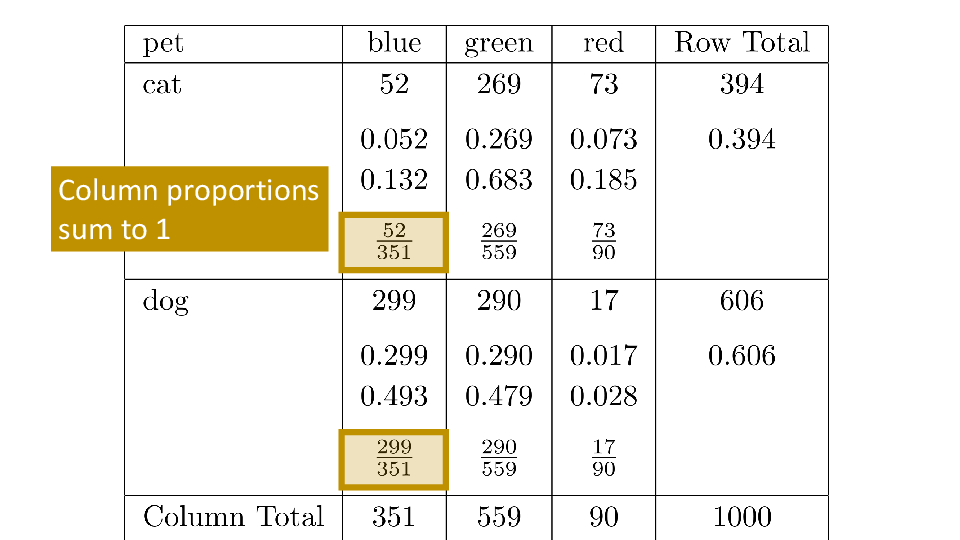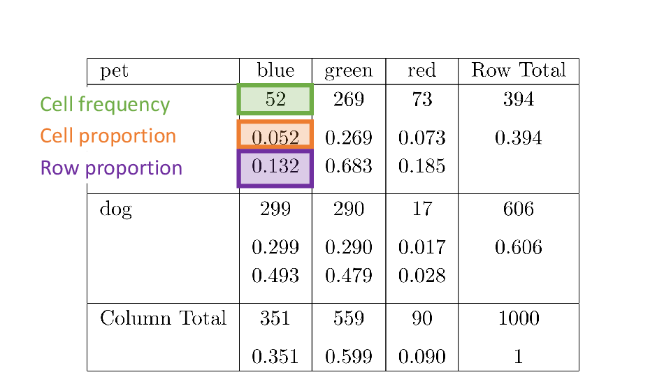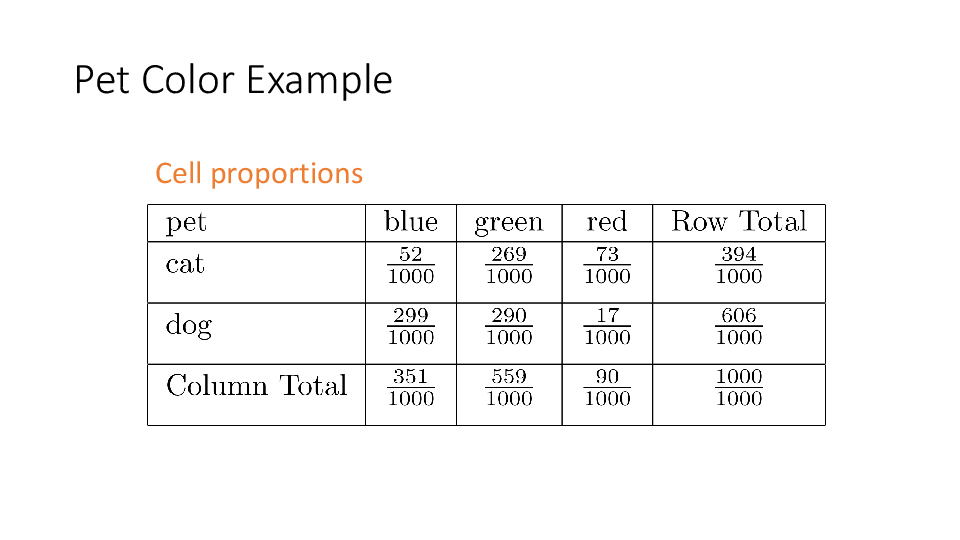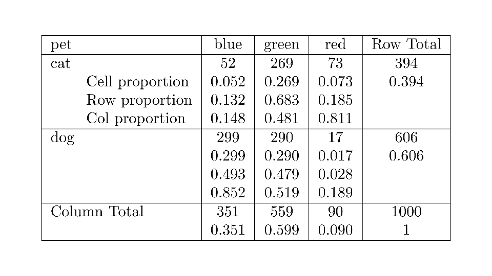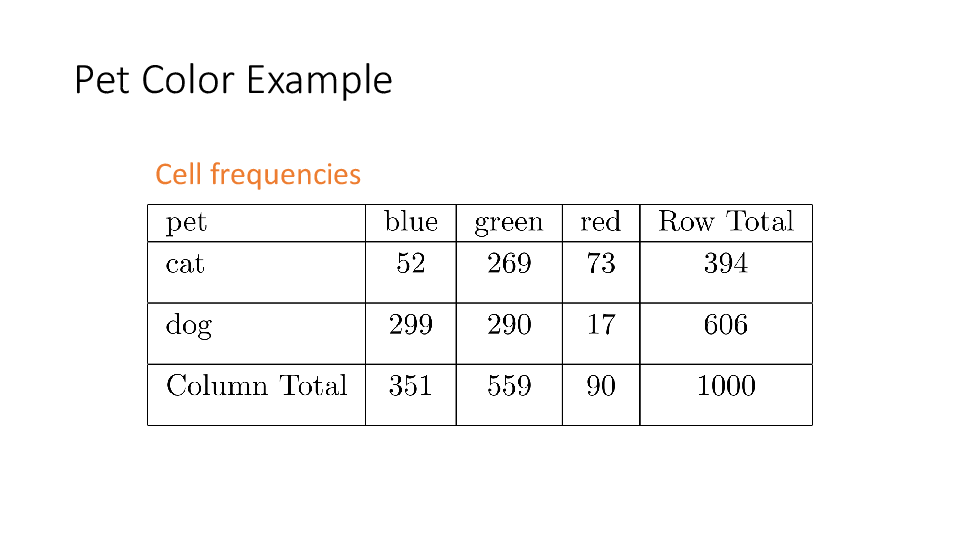 When working with two outcomes, it is often helpful to organize the data into a cross table. In the table below, the counts of two outcomes—favorite color and pet preference—are tabulated. Favorite color has three options: blue, green, and red. Pet preference has two options: cat or dog. The cross table shows the counts of all possible joint outcomes; there are 6. Rather than listing the counts as a list, the counts are reported in a matrix, with pet preference along the rows and color preference along the columns.