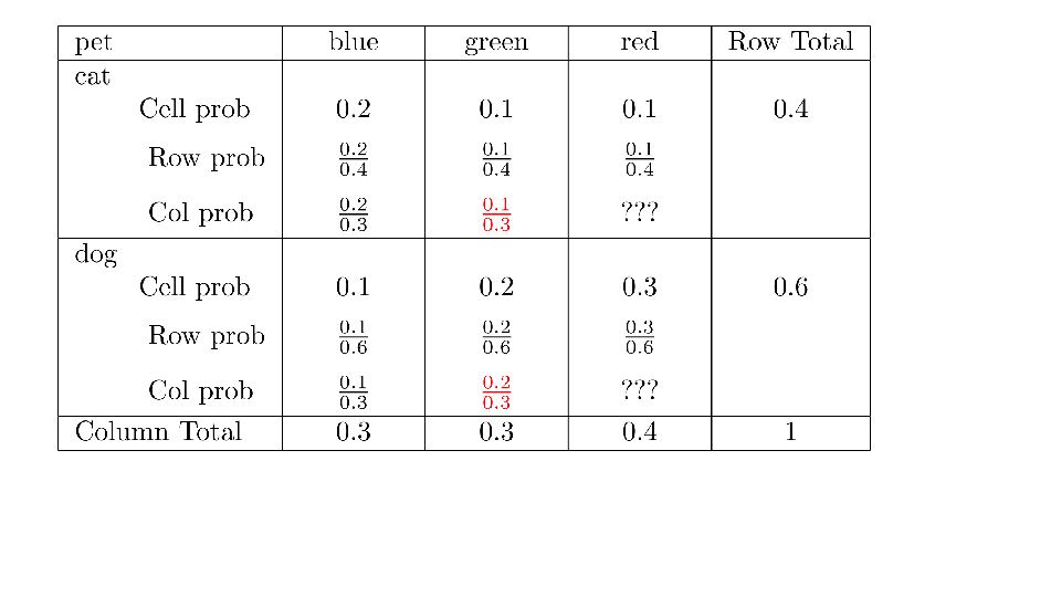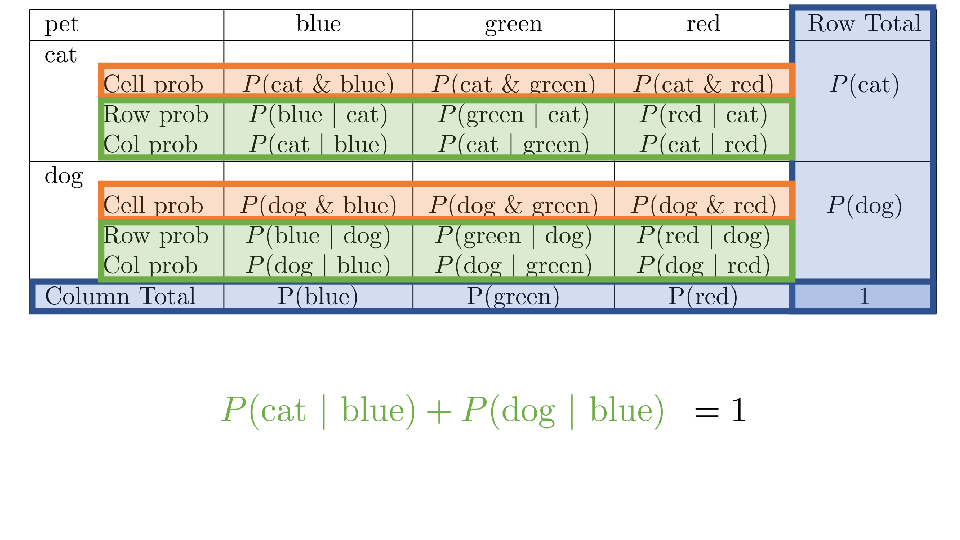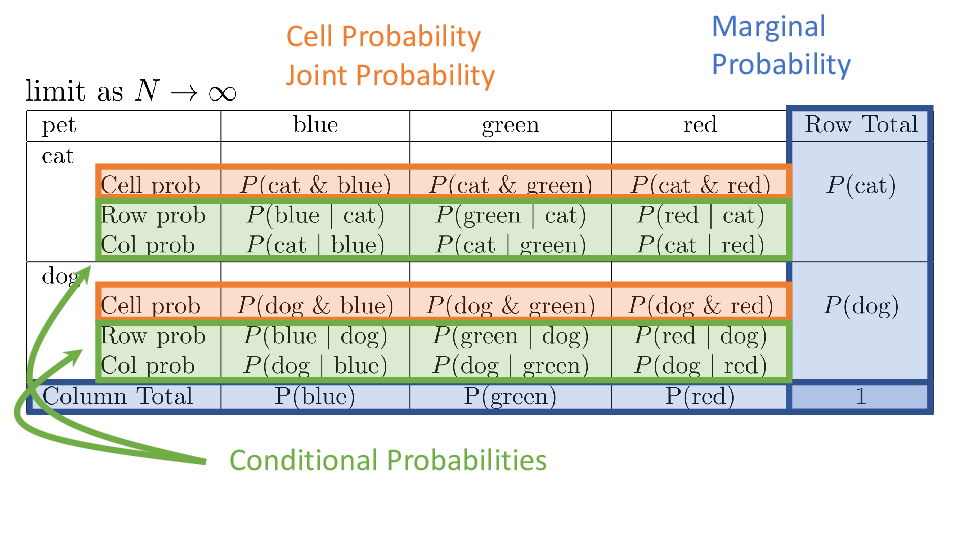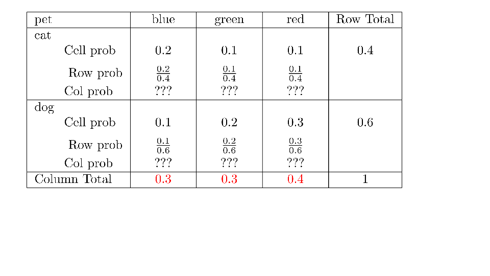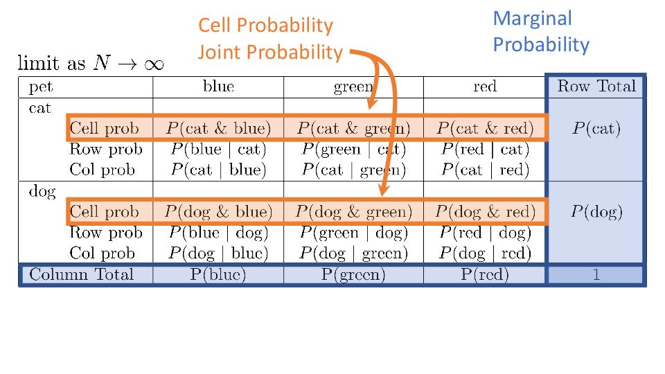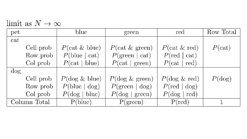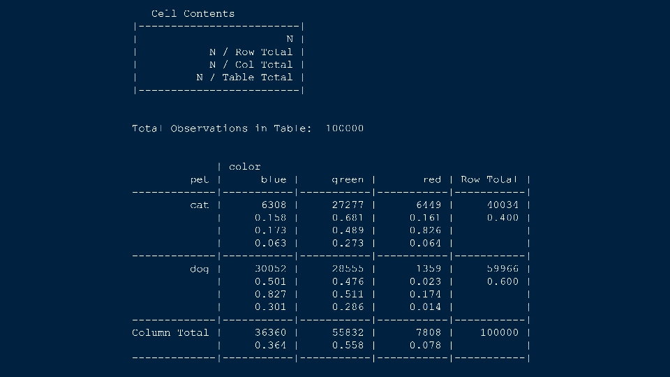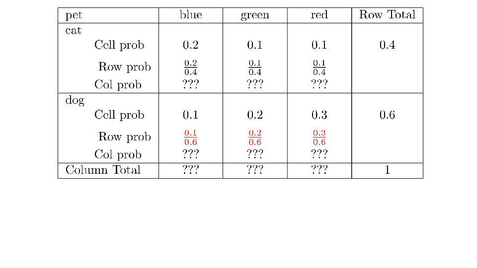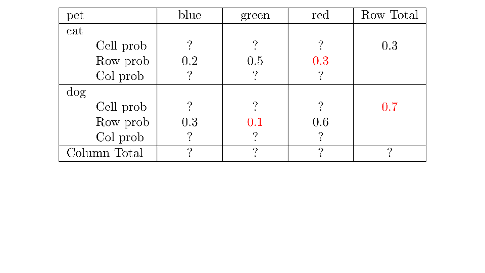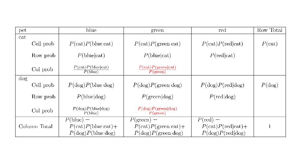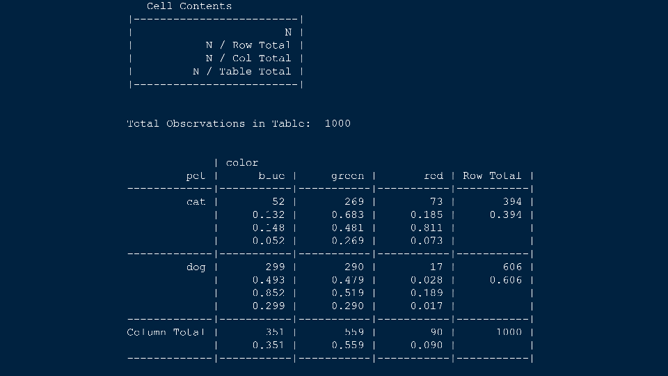 When working with two outcomes, it is often helpful to organize the data into a cross table. In the table below, the counts of two outcomes—favorite color and pet preference—are tabulated. Favorite color has three options: blue, green, and red. Pet preference has two options: cat or dog. The cross table shows the counts of all possible joint outcomes; there are 6. Rather than listing the counts as a list, the counts are reported in a matrix, with pet preference along the rows and color preference along the columns.