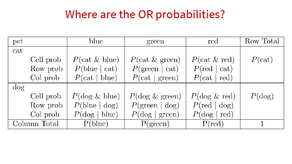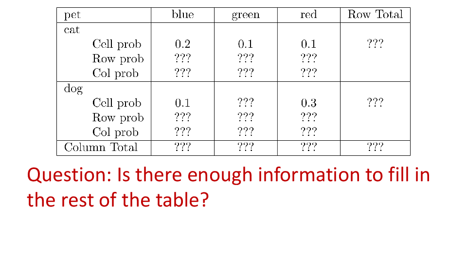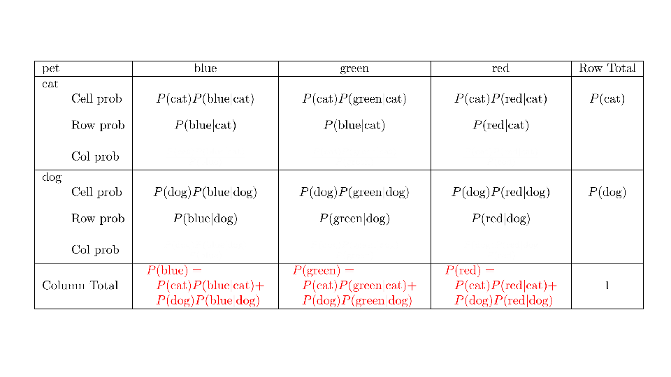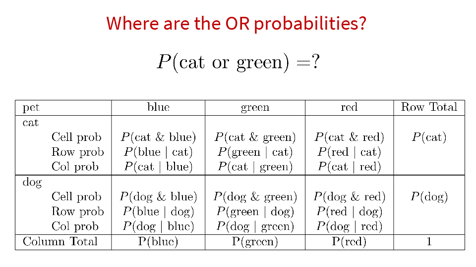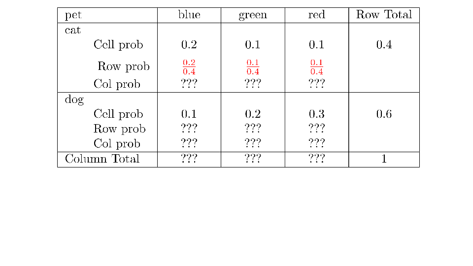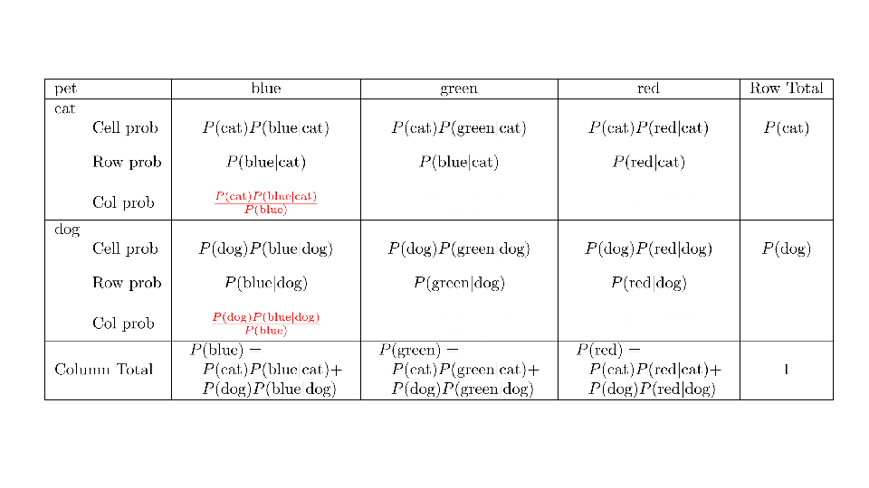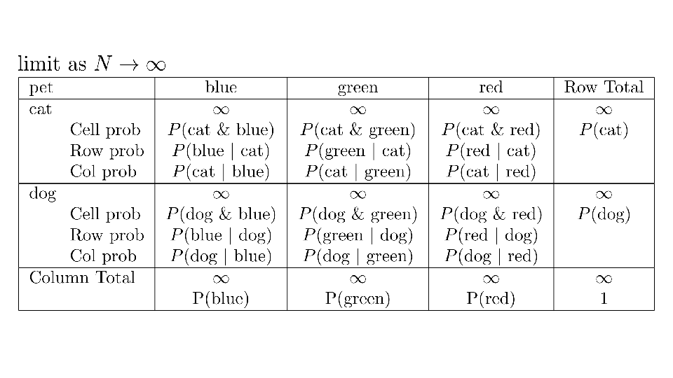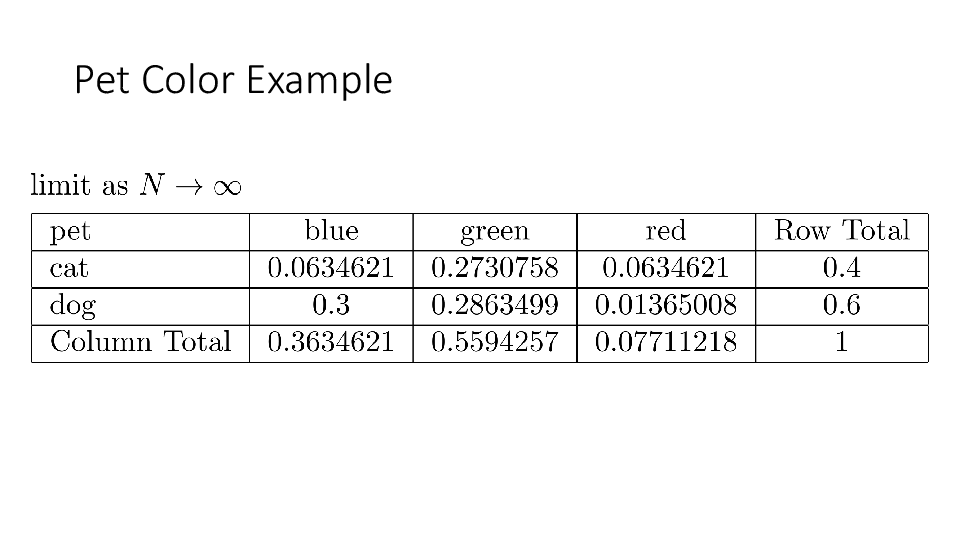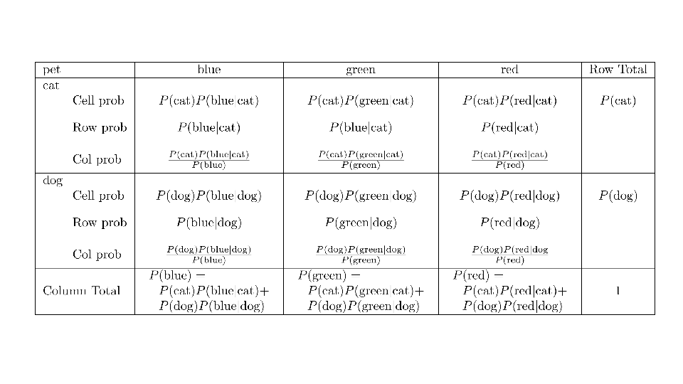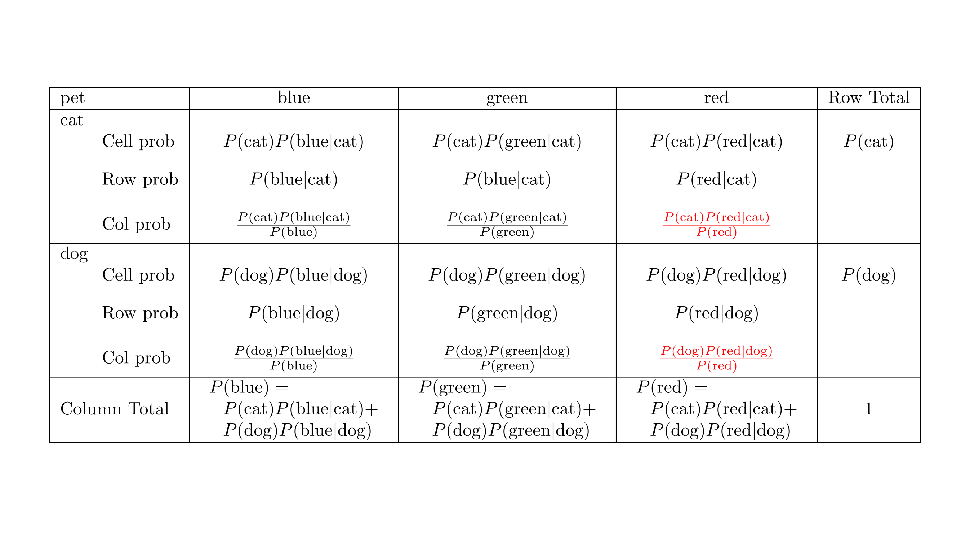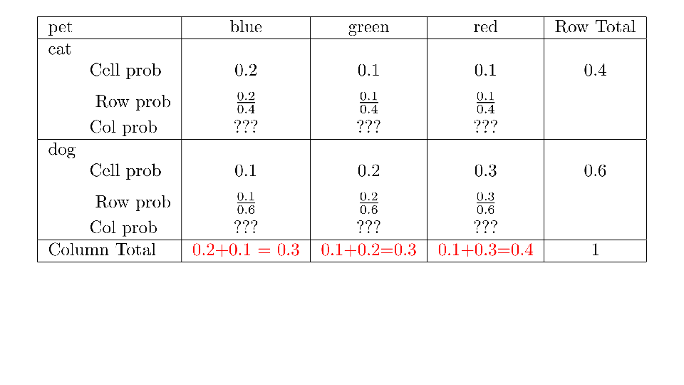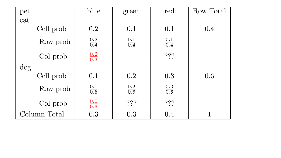 When working with two outcomes, it is often helpful to organize the data into a cross table. In the table below, the counts of two outcomes—favorite color and pet preference—are tabulated. Favorite color has three options: blue, green, and red. Pet preference has two options: cat or dog. The cross table shows the counts of all possible joint outcomes; there are 6. Rather than listing the counts as a list, the counts are reported in a matrix, with pet preference along the rows and color preference along the columns.