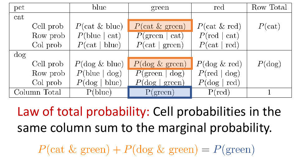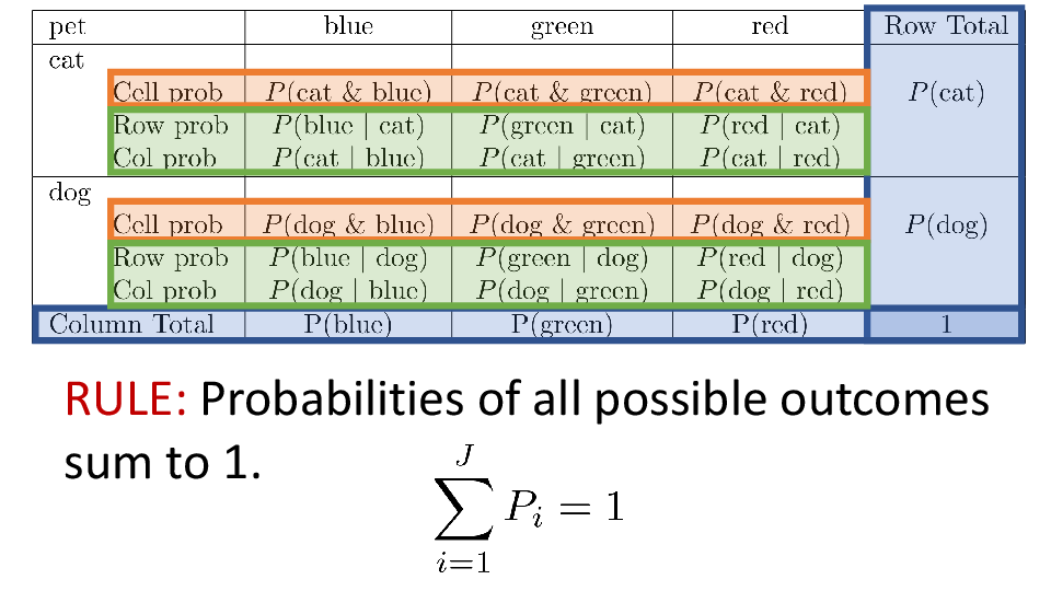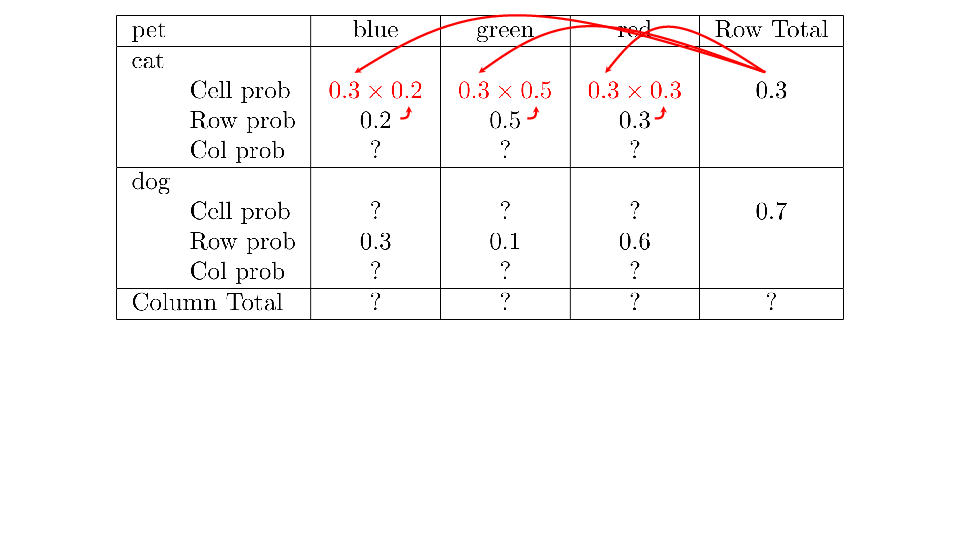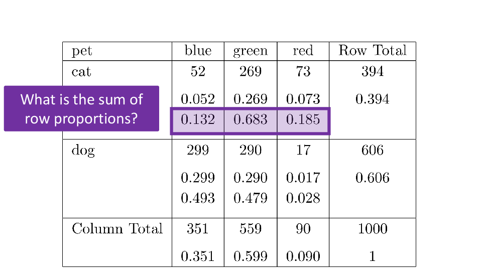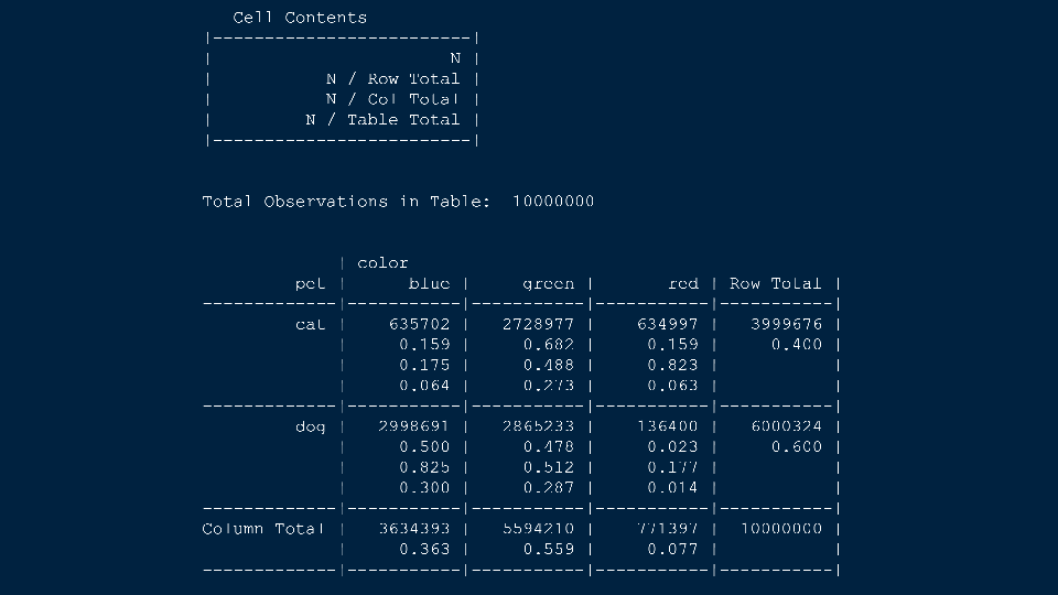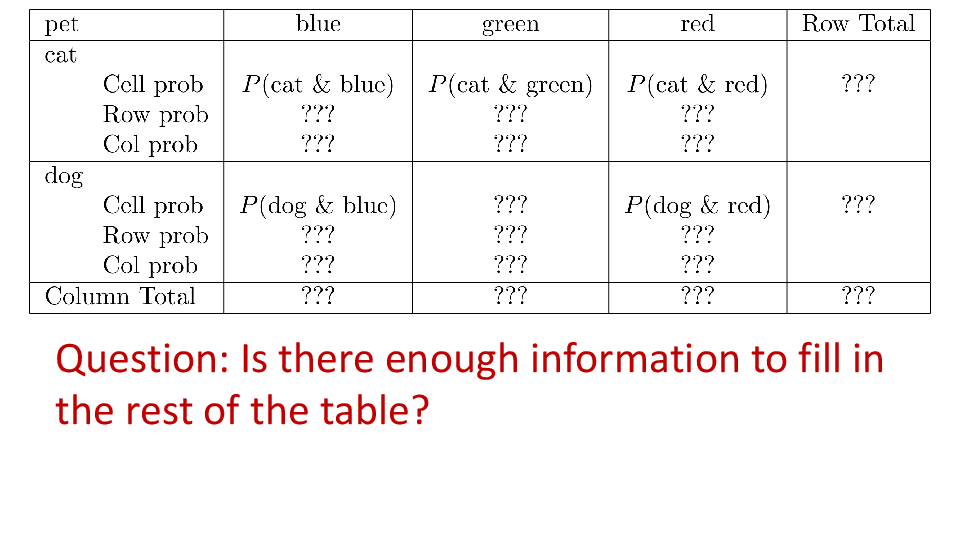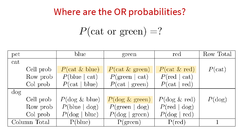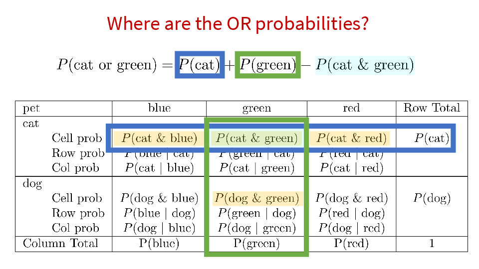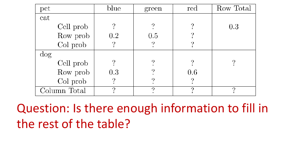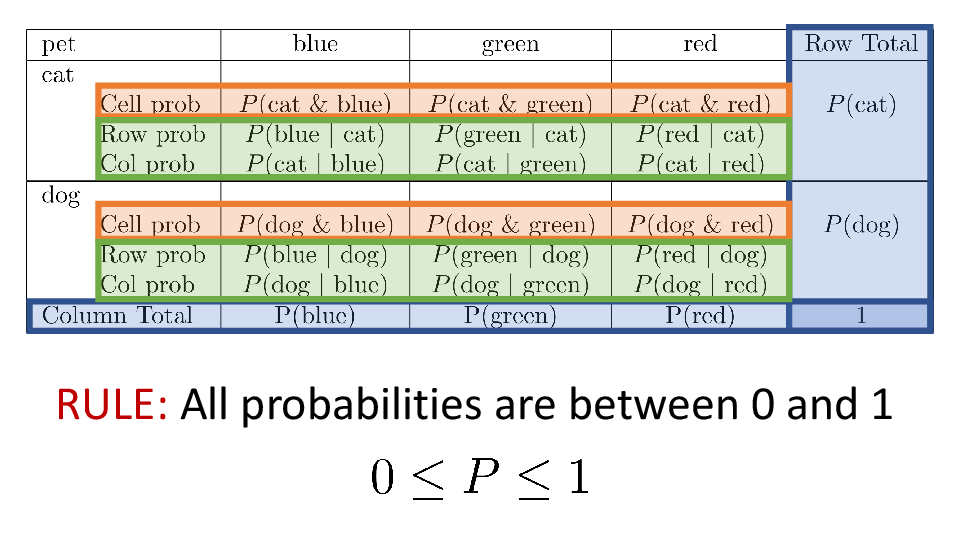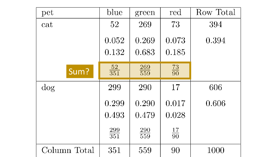 When working with two outcomes, it is often helpful to organize the data into a cross table. In the table below, the counts of two outcomes—favorite color and pet preference—are tabulated. Favorite color has three options: blue, green, and red. Pet preference has two options: cat or dog. The cross table shows the counts of all possible joint outcomes; there are 6. Rather than listing the counts as a list, the counts are reported in a matrix, with pet preference along the rows and color preference along the columns.