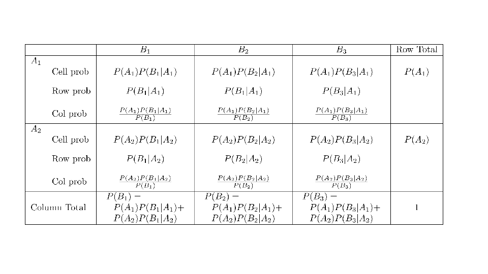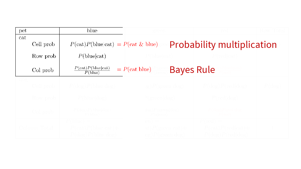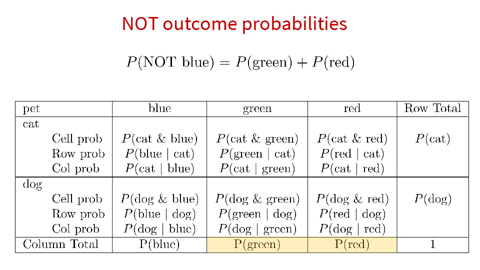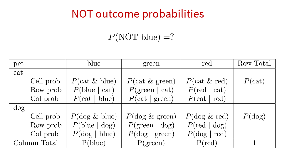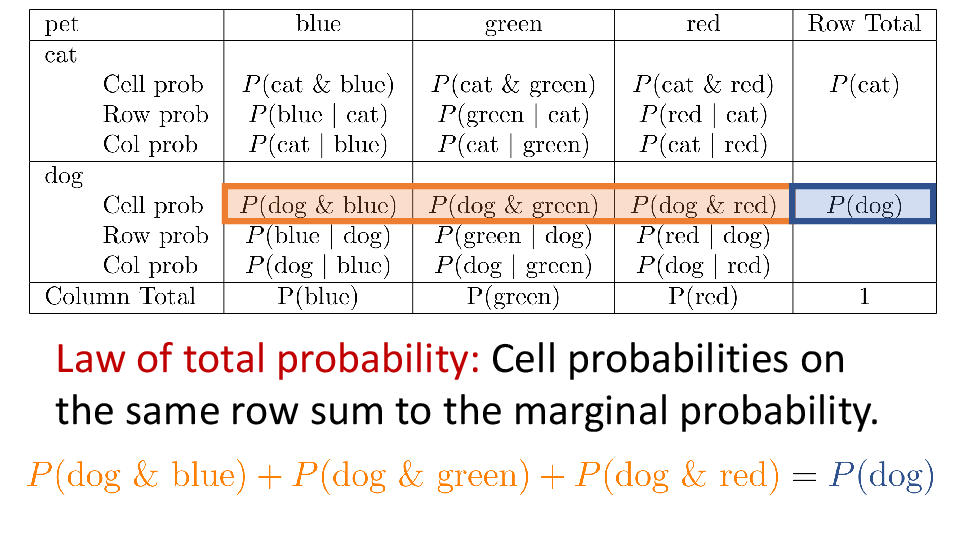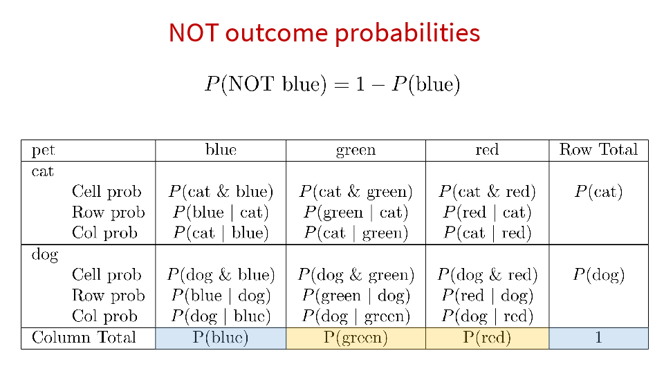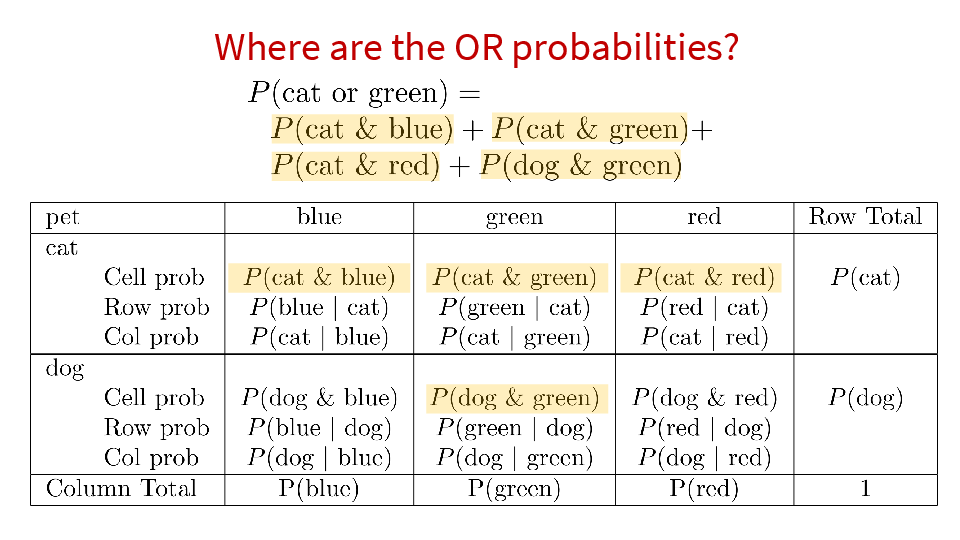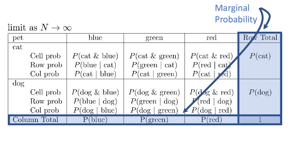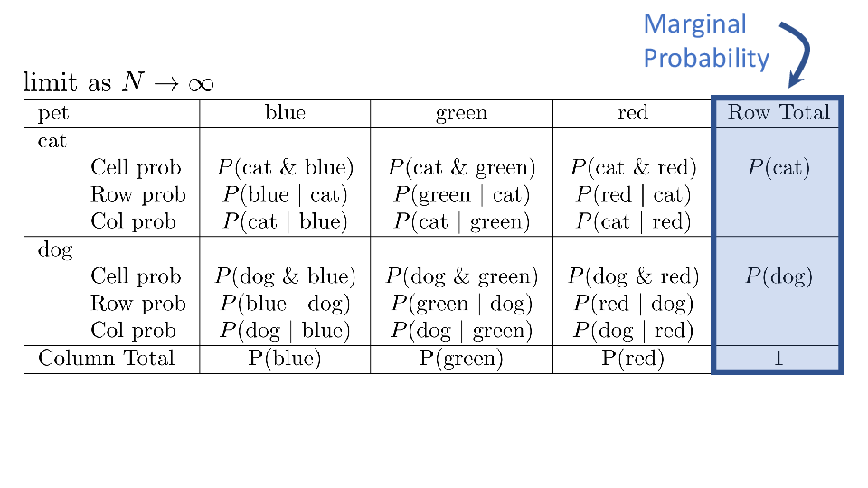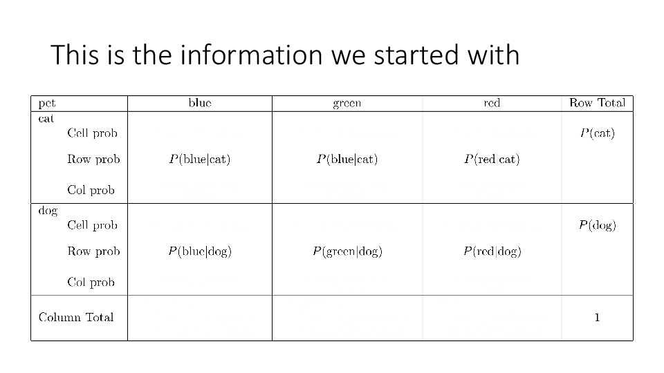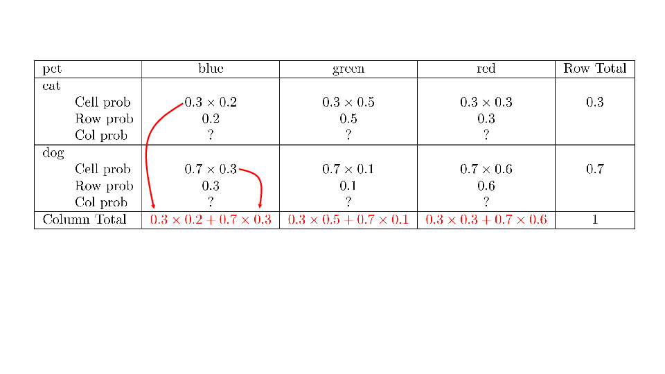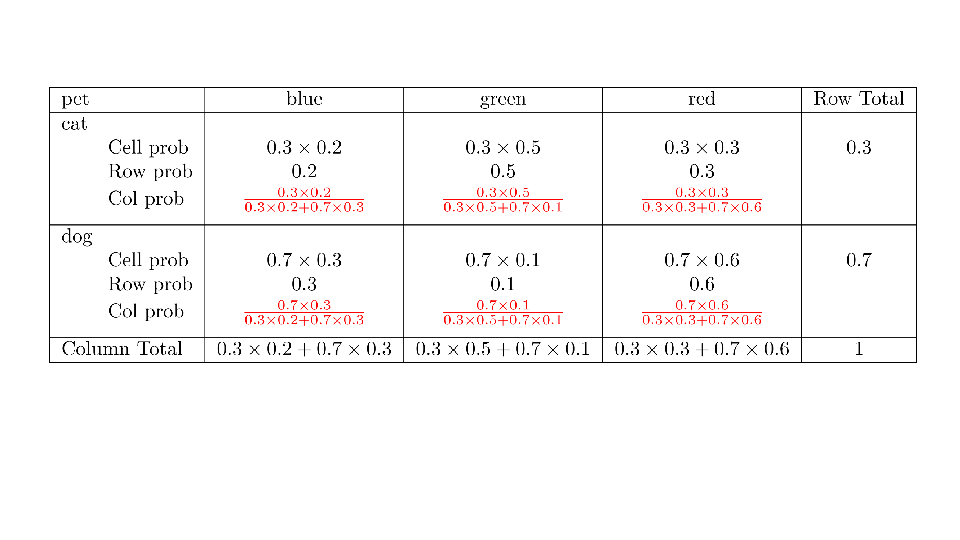 When working with two outcomes, it is often helpful to organize the data into a cross table. In the table below, the counts of two outcomes—favorite color and pet preference—are tabulated. Favorite color has three options: blue, green, and red. Pet preference has two options: cat or dog. The cross table shows the counts of all possible joint outcomes; there are 6. Rather than listing the counts as a list, the counts are reported in a matrix, with pet preference along the rows and color preference along the columns.