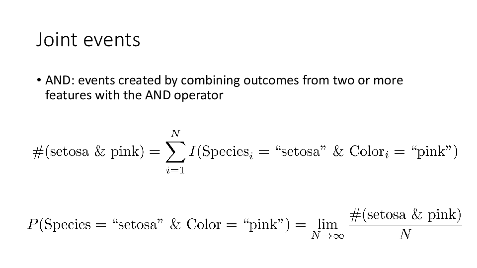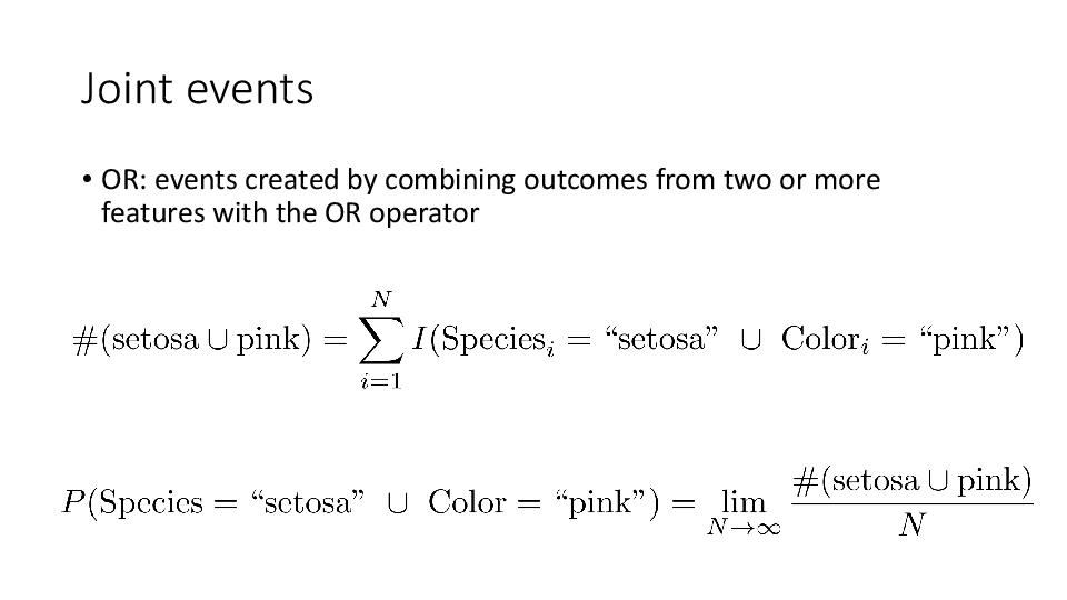 \[ P(\text{Species starts with v}) = P(\text{Species} \in \{\text{versicolor}, \text{virginica} \}) \]