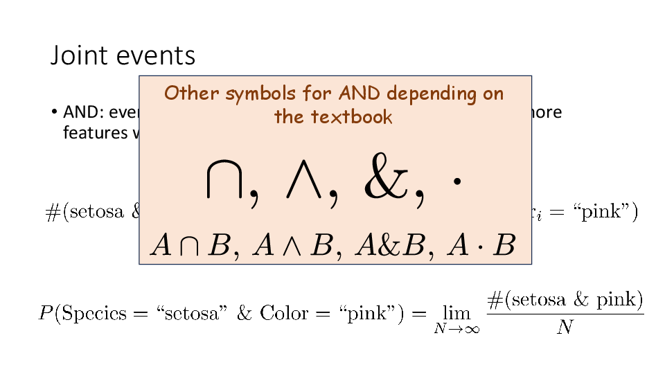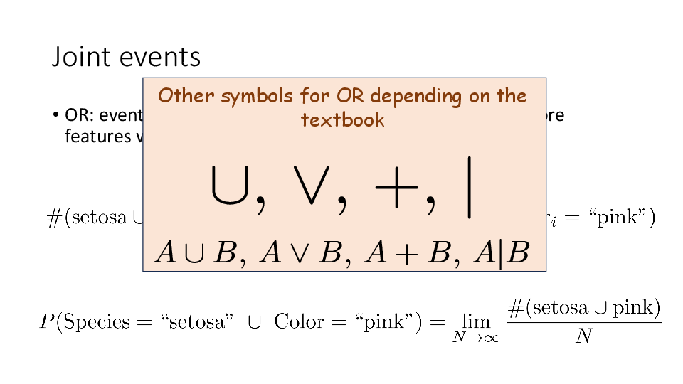 Just like events or outcomes can be defined with the AND opporator, events can also be defined with the OR operator. One might be interested in \(P(\text{Setosa or pink})\).