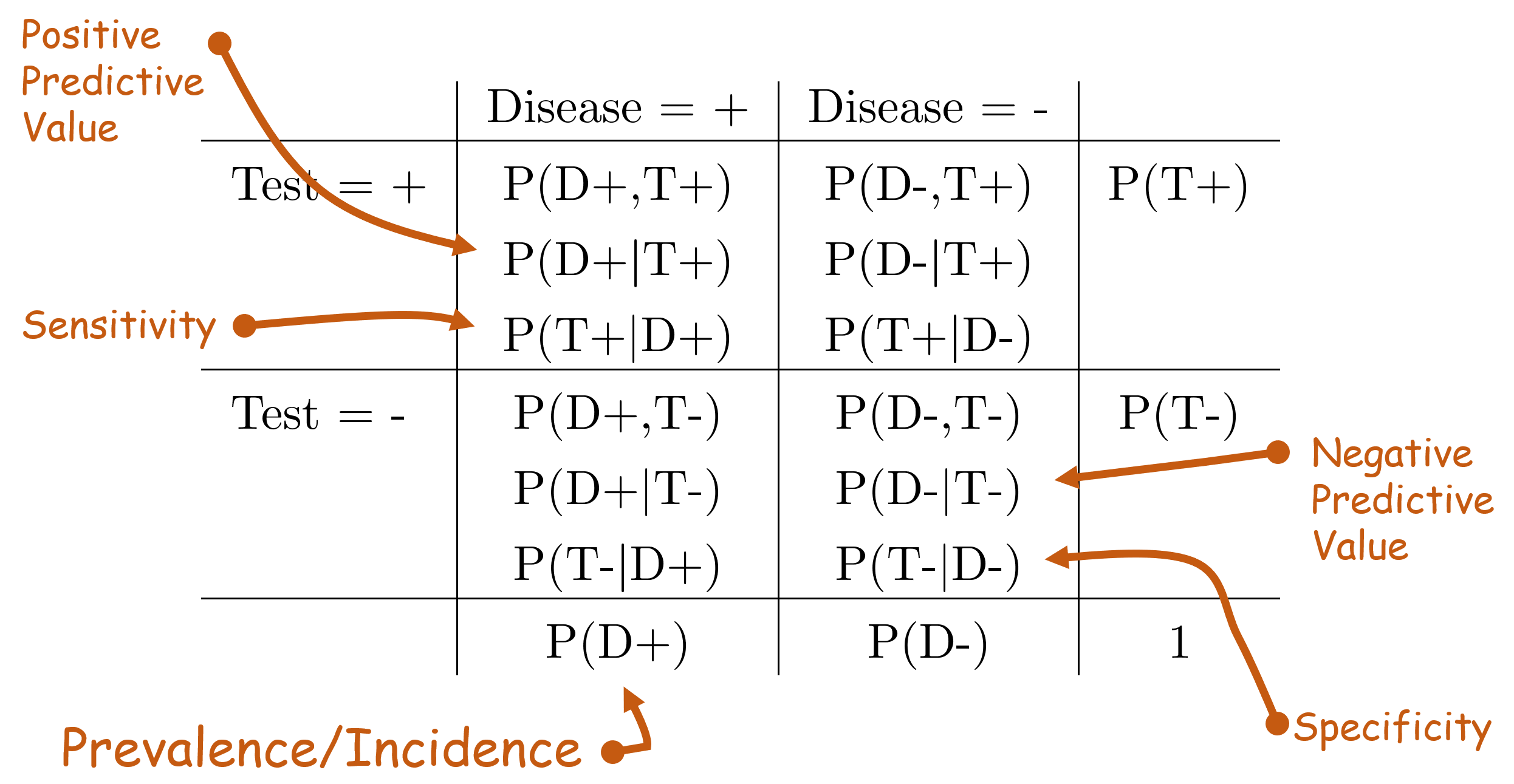 The two outcomes can be organized is a \(2\times 2\) table. All of the joint, conditional, and marginal probabilities are in the table as before; however, in the context of diagnostics, some of the probabilities have special names.